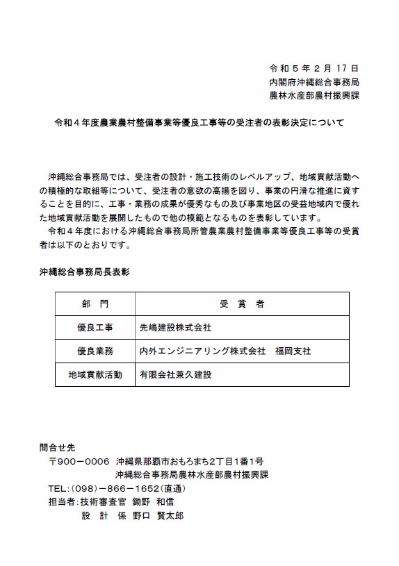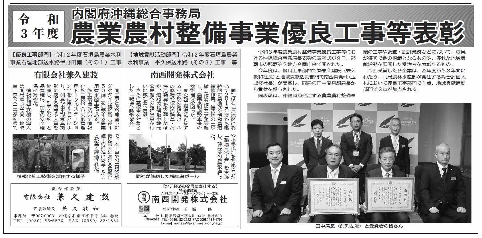 | 石垣島農業水利事業 二又送水路他大里農道工区(その2)工事 | 元請 |